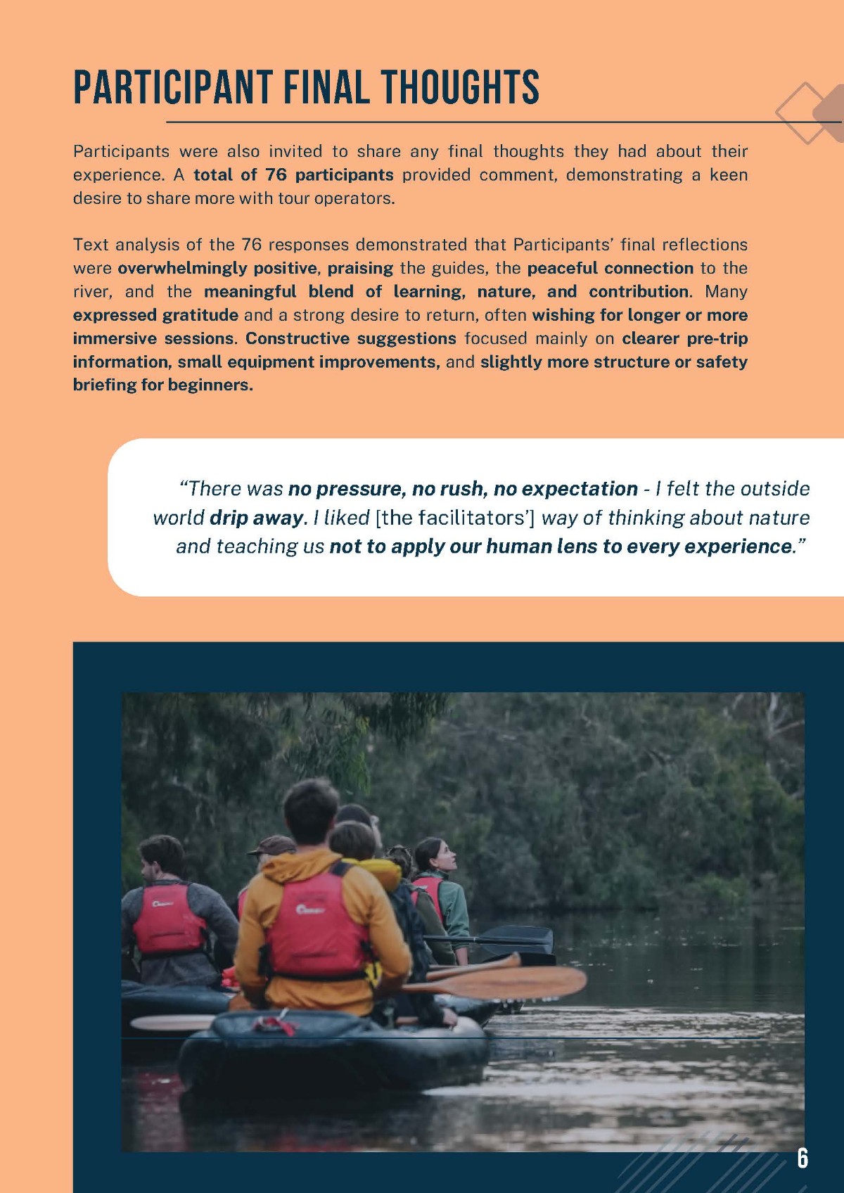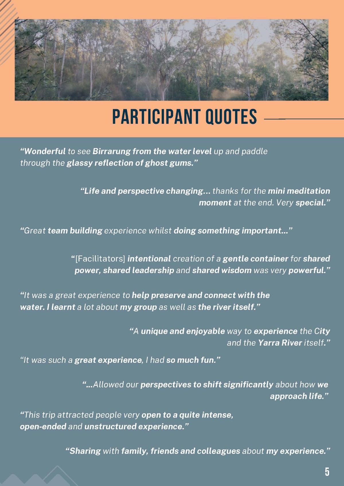 "Participants engaging in Burndap Birrarung burndap umarkoo experiences consistently described them as peaceful, restorative and deeply connective, both to nature and one another".